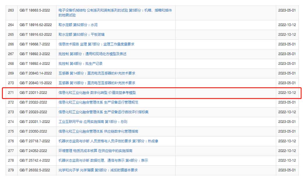 20221014日,國家市場監(jiān)督管理總局(國家標(biāo)準(zhǔn)化管理委員會)發(fā)布2022年第13號中國國家標(biāo)準(zhǔn)公告,批準(zhǔn)國家標(biāo)準(zhǔn)GB/T 23011-2022《信息化和工業(yè)化融合 數(shù)字化轉(zhuǎn)型 價(jià)值效益參考模型》(簡稱《數(shù)字化轉(zhuǎn)型 價(jià)值效益參考模型》)正式發(fā)布,該標(biāo)準(zhǔn)是立足兩化融合發(fā)展過程中數(shù)字化轉(zhuǎn)型效益衡量這以關(guān)鍵需求研制發(fā)布的一項(xiàng)重要國家標(biāo)準(zhǔn),對以標(biāo)準(zhǔn)引領(lǐng)量化深度融合、加快新型工業(yè)化發(fā)展具有重要意義。